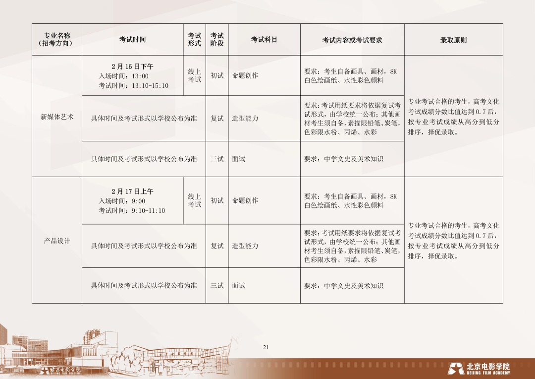 北影2023年采取線上初試,復(fù)試形式待定,與美術(shù)相關(guān)??紝I(yè)有戲劇影視美術(shù)設(shè)計、新媒體藝術(shù)、環(huán)境設(shè)計、產(chǎn)品設(shè)計、動畫、漫畫、數(shù)字媒體藝術(shù),跨媒體藝術(shù)專業(yè)。考生最多可兼報3個專業(yè)(方向),且考試成績不通用,所有的專業(yè)都需參加不同的考試。