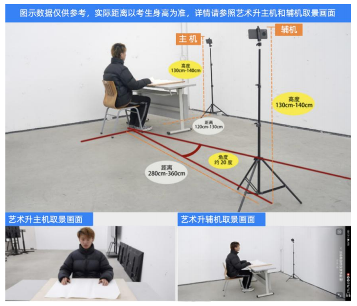 (二)考試空間(考場(chǎng))1.考生應(yīng)選擇安靜整潔、光線明亮的獨(dú)立房間作為考場(chǎng),房間內(nèi)不得出現(xiàn)與考試內(nèi)容相關(guān)的信息(含文字、圖片、音頻、視頻等),不得出現(xiàn)與考試內(nèi)容相關(guān)的物品(參考書、電子產(chǎn)品等),不得出現(xiàn)鏡面;2.根據(jù)下方機(jī)位圖調(diào)整主機(jī)與輔機(jī)的擺放位置(圖示僅供參考,實(shí)際可根據(jù)考生身高視情調(diào)整)。視頻拍攝要求:聚焦清楚、曝光適度、畫面清晰、穩(wěn)定流暢、聲音真實(shí)無雜音。因未按要求操作或拍攝不清晰、不完整等導(dǎo)致的后果,由考生本人承擔(dān)。請(qǐng)考生提前確認(rèn)拍攝的最佳距離、角度和位置。