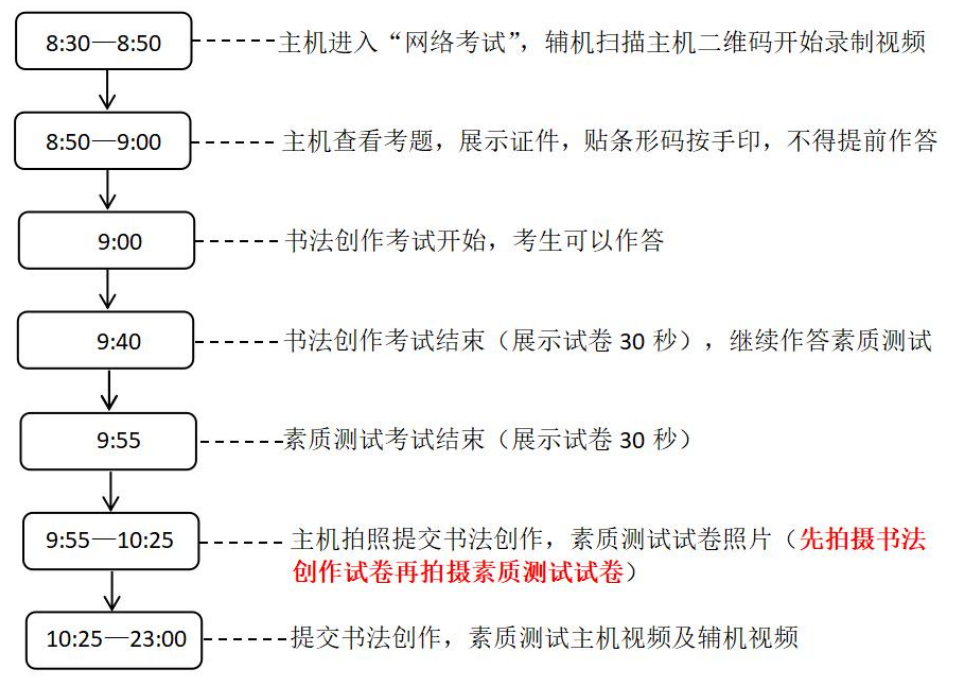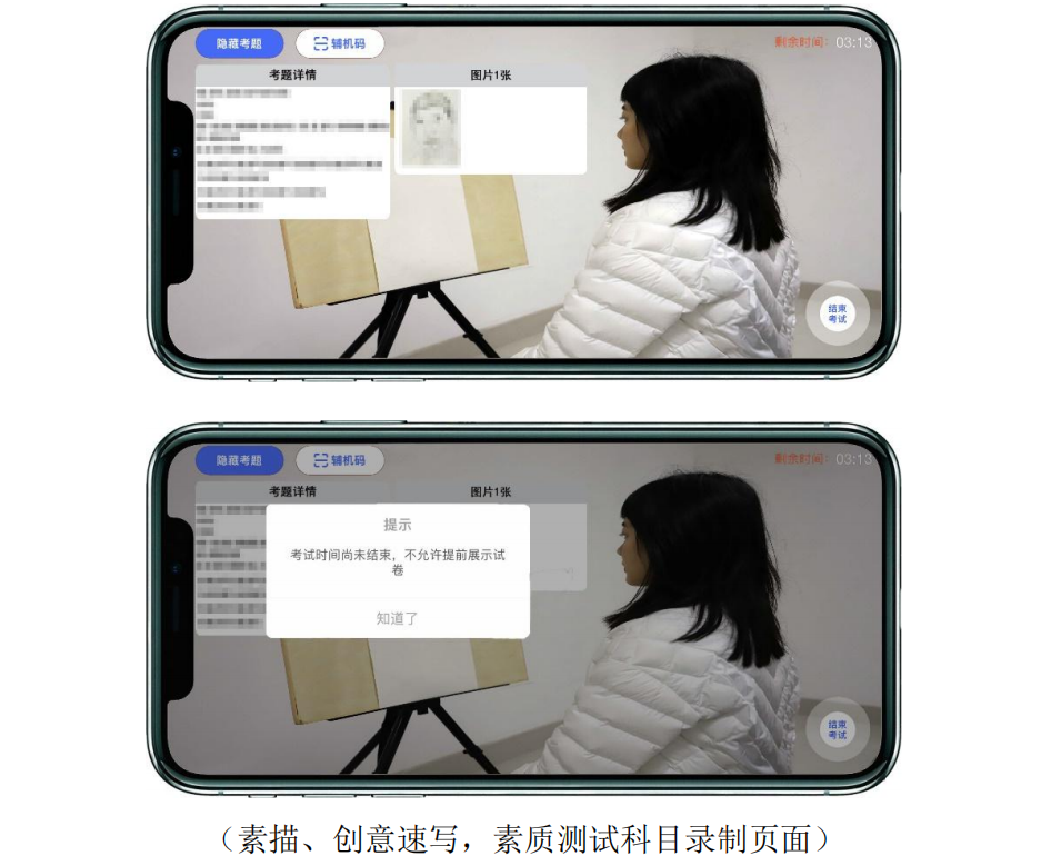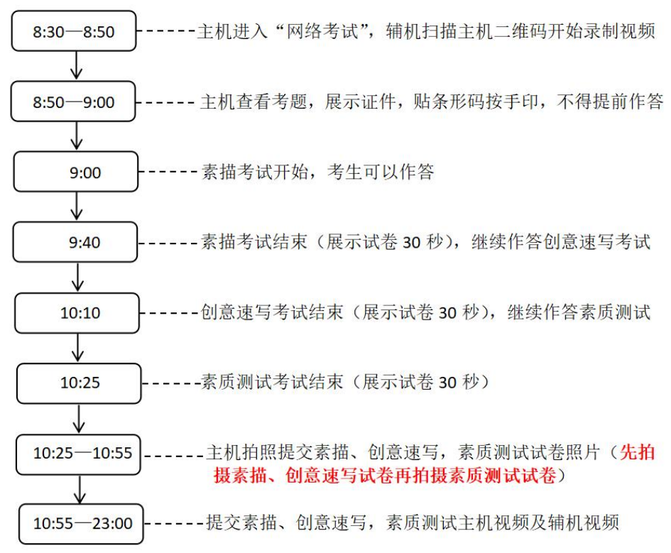 特別提醒:1.考生須嚴(yán)格按照時(shí)間要求依次“拍照提交素描、創(chuàng)意速寫(書法創(chuàng)作),素質(zhì)測(cè)試試卷照片→提交主機(jī)視頻→提交輔機(jī)視頻”才算完成考試,超時(shí)將不能提交,考試成績(jī)無效;