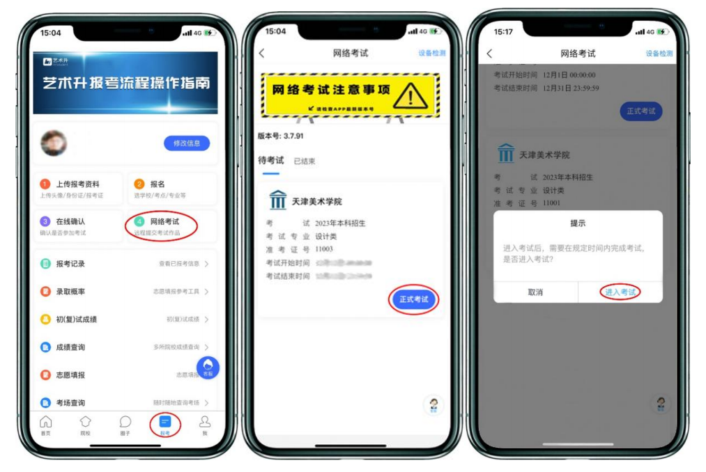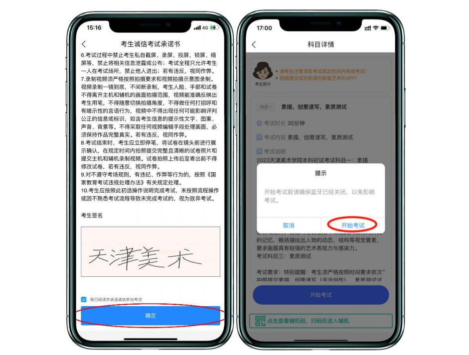 (二)考試操作說明1.主機(jī)登錄、選擇“網(wǎng)絡(luò)考試”、簽訂誠信考試承諾書主機(jī)在考前 30 分鐘登錄“藝術(shù)升”APP 在首頁或報(bào)考頁面選擇“網(wǎng)絡(luò)考試”,進(jìn)入“天津美術(shù)學(xué)院 2023 年本科招生初選”,選擇“正式考試”,點(diǎn)擊正式考試按鍵后會(huì)提示考生閱讀《考生誠信考試承諾書》,考生須逐條仔細(xì)閱讀后,勾選“我已閱讀并承諾誠信參加考試”并簽字確認(rèn)。在進(jìn)入正式考試前請(qǐng)仔細(xì)閱讀考試提示信息,再選擇“開始考試”。