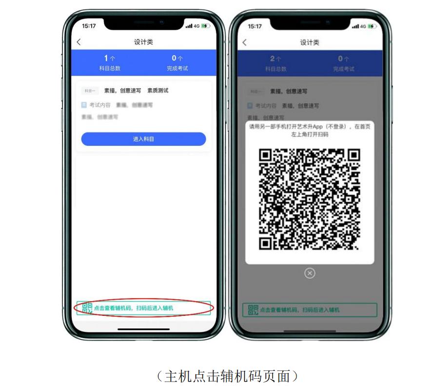 2.輔機(jī)掃描主機(jī)生成的二維碼在主機(jī)上點(diǎn)擊“開始考試”,在“科目詳情”頁面,點(diǎn)擊綠色方框內(nèi)的“點(diǎn)擊查看輔機(jī)碼,掃碼后進(jìn)入輔機(jī)”。此時(shí)需要用輔機(jī)打開“藝術(shù)升”APP(注意:輔機(jī)只打開“藝術(shù)升”主頁,不要登錄),在輔機(jī)“藝術(shù)升”首頁左上角打開掃描工具“【—】”,輔機(jī)掃描主機(jī)上彈出的二維碼,掃碼成功后主機(jī)方可進(jìn)入錄制狀態(tài)。注:如輔機(jī)不開啟錄制將無法進(jìn)行考試。輔機(jī)進(jìn)入錄制,左下角“已錄制”開始計(jì)時(shí)才表明輔機(jī)錄制開始。