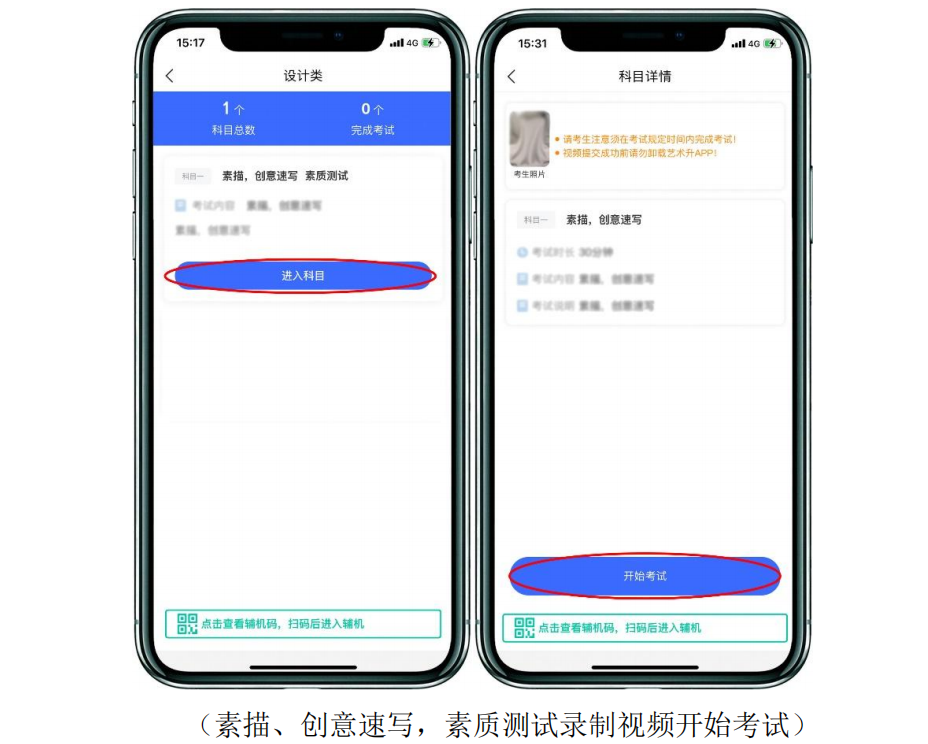 3.查看考題,展示證件,貼條形碼按手印,不得提前作答輔機(jī)掃描主機(jī)二維碼并開始錄制后,考生點(diǎn)擊素描、創(chuàng)意速寫(書法創(chuàng)作),素質(zhì)測(cè)試的“進(jìn)入科目”,再點(diǎn)擊“開始考試”錄制視頻,主機(jī)將要求考生進(jìn)行人臉識(shí)別認(rèn)證,考生須按照提示進(jìn)行操作,通過驗(yàn)證后可以查看考題。