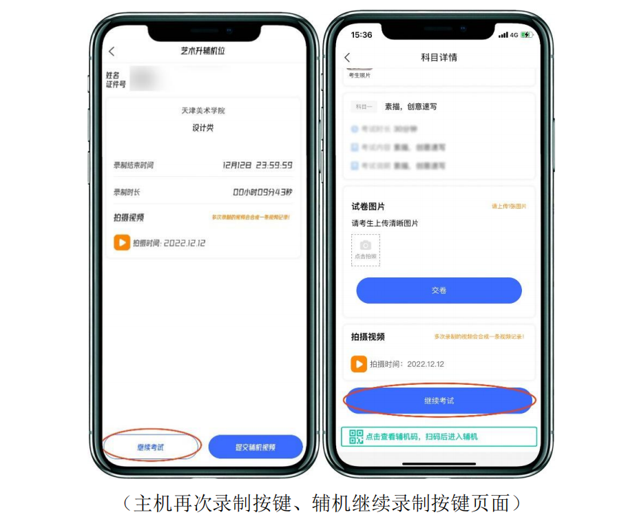4.素描考試開始根據(jù)語音提示開始作答,先作答素描考試,視頻錄制過程中,考生可在主機(jī)上同時(shí)查看考題。如主機(jī)出現(xiàn)關(guān)機(jī)、鎖屏、意外中斷等情況,可重新進(jìn)入網(wǎng)絡(luò)考試,點(diǎn)擊“繼續(xù)考試”按鈕,繼續(xù)錄制主機(jī)視頻;如輔機(jī)出現(xiàn)關(guān)機(jī)、鎖屏、意外中斷等情況,請(qǐng)考生點(diǎn)擊主機(jī)錄制頁面左上角的“輔機(jī)碼”彈出二維碼,重新掃碼錄制或點(diǎn)擊輔機(jī)屏幕上的“繼續(xù)考試”按鈕。