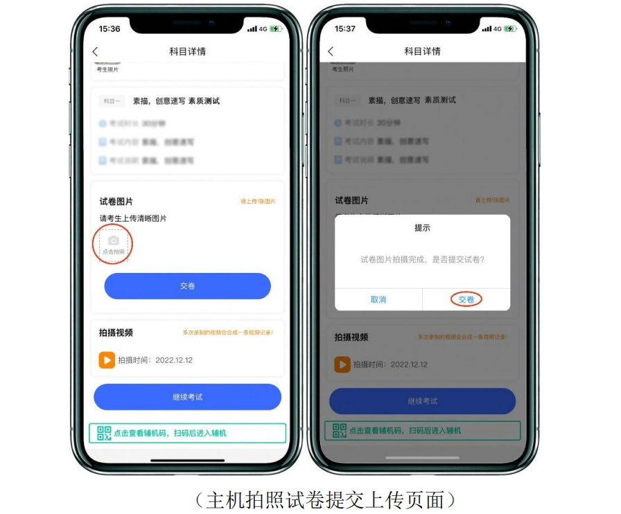 展示試卷完成后先拍攝素描、創(chuàng)意速寫(書法創(chuàng)作)試卷,再拍攝素質(zhì)測(cè)試試卷照片上傳(共兩張照片),如試卷拍照不合格,可重新拍照交卷,上傳成功后會(huì)有彈框提示【試卷圖片拍攝完成,是否提交試卷】,考生確認(rèn)無誤后,請(qǐng)點(diǎn)擊【交卷】按鈕,交卷過程必須在輔機(jī)視頻監(jiān)控下進(jìn)行。