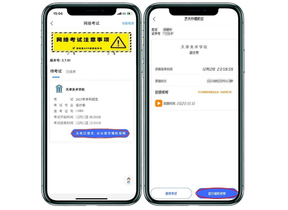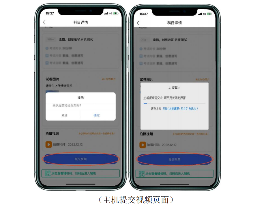 10.提交輔機(jī)視頻主機(jī)視頻提交完成后,返回“網(wǎng)絡(luò)考試”界面,此時(shí)頁面下方按鍵會(huì)變?yōu)椤爸鳈C(jī)已提交,點(diǎn)擊提交輔機(jī)視頻”,點(diǎn)擊此按鍵,使用輔機(jī)進(jìn)行掃碼,提交輔機(jī)視頻(或使用輔機(jī)提交輔機(jī)視頻),視頻上傳時(shí)間截止至考試當(dāng)天晚上23:00。