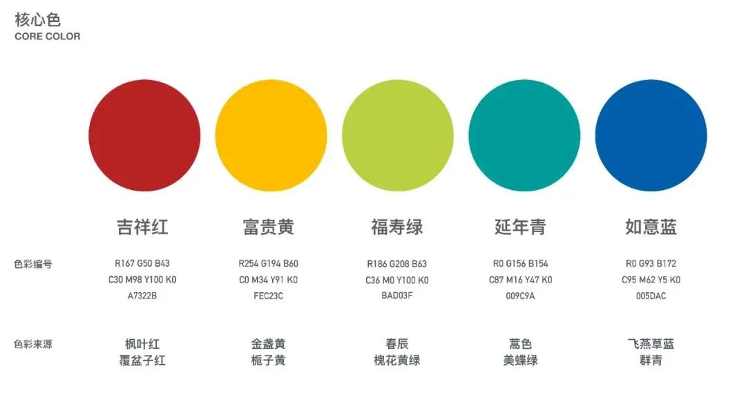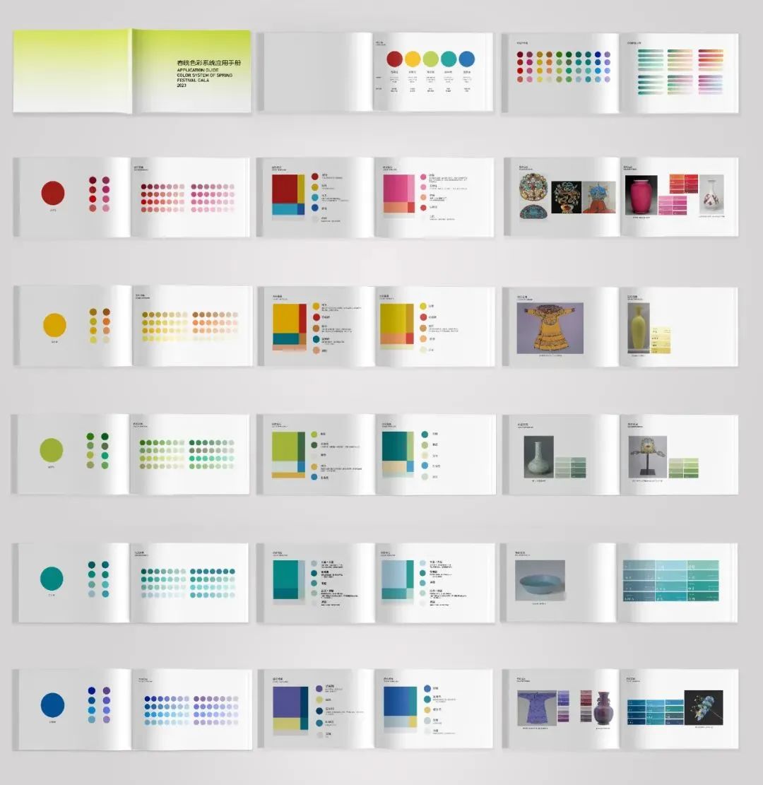 整個(gè)色彩系統(tǒng)設(shè)計(jì)的起點(diǎn)來自于對(duì)于中國傳統(tǒng)色彩的追尋,中國人從自然萬物、天地四時(shí)中尋覓色彩,這種“尋色”飽含著中國人對(duì)自然的敬意、對(duì)生活的詩意和對(duì)未來的寓意;遵循著這樣的理念,團(tuán)隊(duì)首先從中國傳統(tǒng)色中“拾色”——提煉并組合出五個(gè)具有吉祥寓意的吉祥五色,并將每個(gè)主色延展成8種延伸色,形成40種可應(yīng)用色板,以及10套配色模版,從而形成了既包含特定色彩搭配指南,又包含較寬色域的應(yīng)用系統(tǒng)。2023春晚色彩系統(tǒng)應(yīng)用手冊(cè)內(nèi)容(部分)而色彩系統(tǒng)的應(yīng)用是一個(gè)非常具有挑戰(zhàn)的跨學(xué)科的系統(tǒng)工程。如何通過各種觀看終端的屏幕來完美呈現(xiàn)色彩的表現(xiàn)也是團(tuán)隊(duì)著力攻堅(jiān)的課題之一。藝術(shù)的“弄色”需要科技的“校色”方式來支撐,從設(shè)計(jì)、制作、錄制到直播,每個(gè)環(huán)節(jié)都要不斷通過設(shè)計(jì)師和工程師聯(lián)合的測(cè)試、校準(zhǔn)和調(diào)整,才能實(shí)現(xiàn)最佳的色彩呈現(xiàn)。
