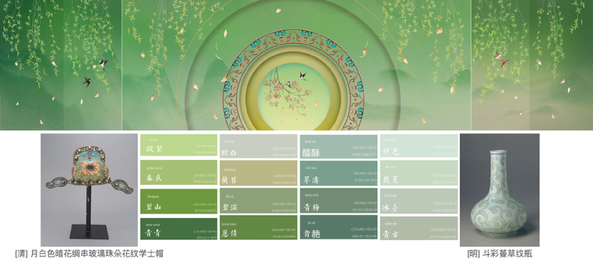 傳統(tǒng)色彩 創(chuàng)新應(yīng)用中國傳統(tǒng)色彩的視覺美學(xué)系統(tǒng)為整體性、系統(tǒng)性地提升整臺(tái)晚會(huì)的美學(xué)調(diào)性,費(fèi)俊帶領(lǐng)團(tuán)隊(duì)建立了一套屬于春晚的色彩系統(tǒng),并設(shè)計(jì)了一本色彩系統(tǒng)應(yīng)用手冊(cè),這在春晚的歷史上尚屬首次。這本手冊(cè)為所有參與創(chuàng)作和制作的團(tuán)隊(duì)與個(gè)人提供了一套行之有效的配色工具及色彩應(yīng)用指南,這既大大提高了設(shè)計(jì)和制作效率,又為形成更加整體性的視覺美學(xué)奠定了重要的基礎(chǔ)。2023春晚色彩系統(tǒng)應(yīng)用手冊(cè)費(fèi)俊將色彩系統(tǒng)的建構(gòu)和應(yīng)用邏輯概括為“尋色”、“拾色”、“弄色”、“舞色”這四個(gè)階段。
