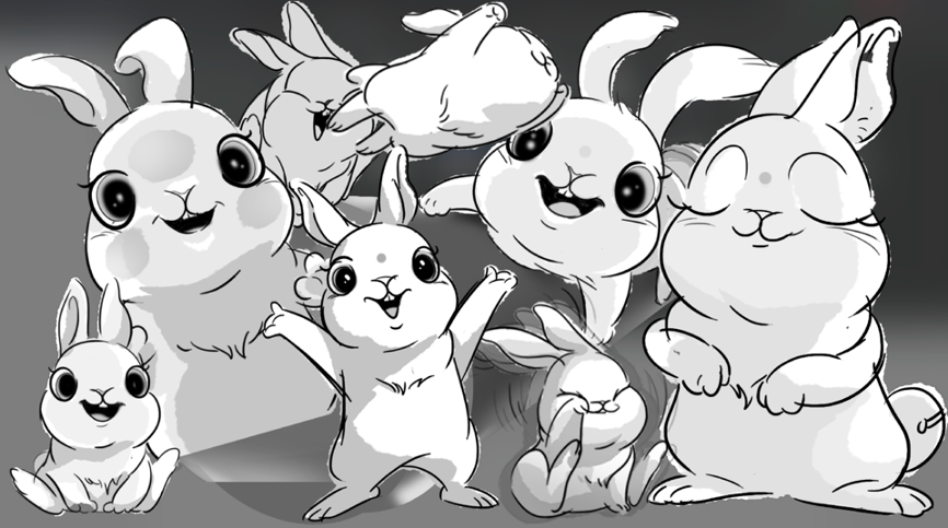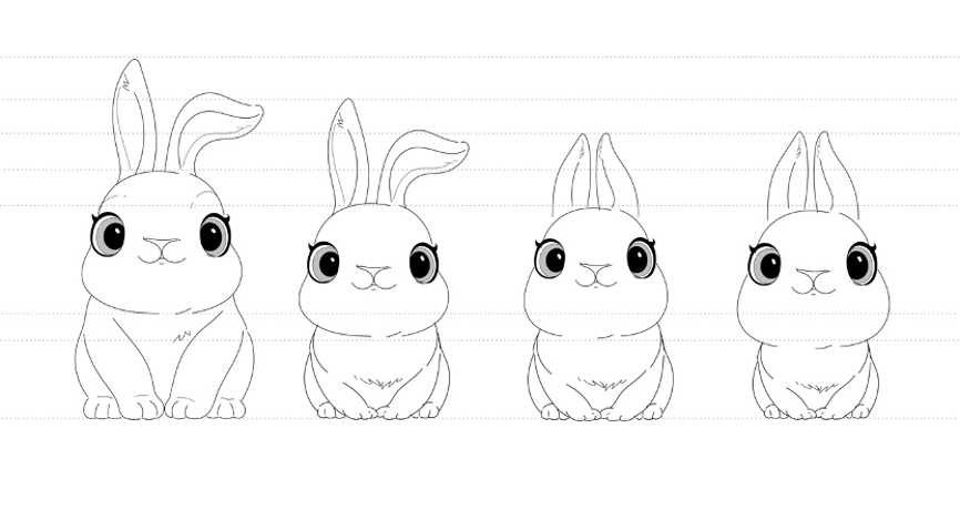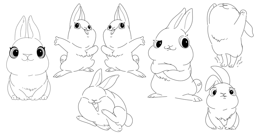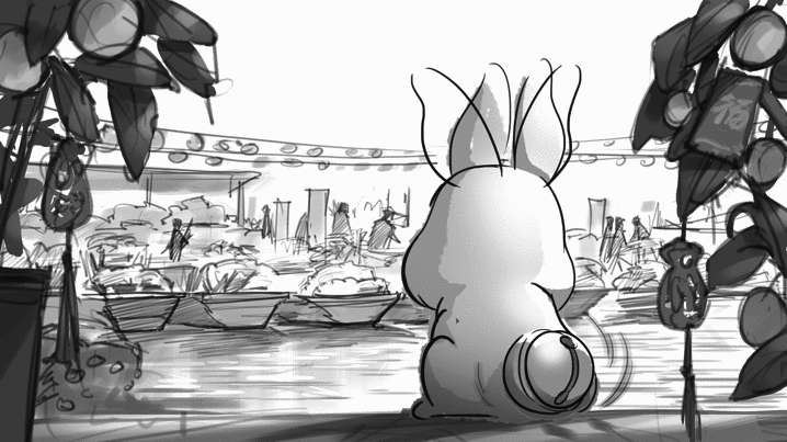 根據(jù)中科院骨脊椎動(dòng)物研究所研究結(jié)果表明,“安徽模鼠兔”為世界最早的兔形動(dòng)物,中國可謂是兔的“第一故鄉(xiāng)”。在“兔圓圓”的造型設(shè)計(jì)中,視覺設(shè)計(jì)團(tuán)隊(duì)與陳湘波一同不斷打磨和推敲,最后確定的形象,保留了真實(shí)中國兔子造型上的特點(diǎn),同時(shí)藝術(shù)化的處理使“兔圓圓”兼具人的表情,更能直觀展現(xiàn)不同的情態(tài)。造型設(shè)定上突出兔的靈動(dòng)、圓融之美,整體線條簡(jiǎn)潔飽滿和圓潤。例如,兔耳選擇了大小適中、豎直圓潤的形態(tài)作為常態(tài),但在不同生存狀態(tài)時(shí)兔耳也有不同姿勢(shì);兔的眼睛力求在“擬人兔”與“寫實(shí)兔”之間找到一種造型的平衡。“兔圓圓”設(shè)計(jì)過程稿 — 比例調(diào)整“兔圓圓”設(shè)計(jì)過程稿 — 造型三視圖“兔圓圓”設(shè)計(jì)過程稿 — 動(dòng)作示意草圖“兔圓圓”還作為整場(chǎng)晚會(huì)第一位出場(chǎng)的“演員”,在開場(chǎng)短片中登場(chǎng)。觀眾們跟隨“兔圓圓”,從充滿節(jié)日氣息的街頭市井,來到鮮花盛開的田野草地,而后乘著直沖云霄的節(jié)日煙火來到外太空,在空間站舷窗外,看到失重環(huán)境下紙花在水膜中開放的獨(dú)特現(xiàn)象,此時(shí)禮花在夜空中綻放,形成了演播大廳舞美天頂?shù)男螤?,也自然地將觀眾帶入晚會(huì)現(xiàn)場(chǎng)。短片通過將“兔圓圓”形象三維化,經(jīng)過不斷打磨,配合實(shí)景拍攝與動(dòng)畫特效,打造出一個(gè)與自然融合、寓意吉祥、形態(tài)可愛、含義豐富的新春形象。這次央美參與視覺設(shè)計(jì)的師生大多來自于設(shè)計(jì)學(xué)院藝術(shù)與科技方向,經(jīng)歷近6個(gè)月的艱苦創(chuàng)作,團(tuán)隊(duì)以鮮活而又扎實(shí)的實(shí)踐,展現(xiàn)了藝術(shù)與科技結(jié)合帶來的視覺想象力與表現(xiàn)力,也拓展了藝術(shù)與科技專業(yè)服務(wù)社會(huì)的應(yīng)用場(chǎng)景,為央美在服務(wù)國家重大文化項(xiàng)目方面增添了一抹靚麗的色彩。費(fèi)俊與晚會(huì)總導(dǎo)演于蕾、央美建筑學(xué)院副院長(zhǎng)崔冬暉團(tuán)隊(duì)成員就主持人背景舞臺(tái)裝置進(jìn)行討論