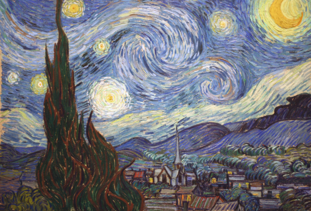 天空中飛卷的星云,好像在旋轉(zhuǎn)著跳舞,好像鮮花一樣怒放,那柔韌的枝條雖然力量微薄,卻無(wú)畏地抽向天空。而直上云端的巨大柏樹(shù),形如一團(tuán)黑色的火舌,不屈地奮力伸展著枝葉。傳達(dá)出作者內(nèi)心的苦悶和憂郁。也表現(xiàn)出人類的掙扎與奮斗。