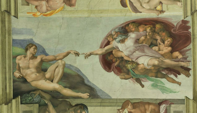 畫中亞當(dāng)?shù)男蜗篌w態(tài)健壯,氣魄宏偉,具有強(qiáng)烈的意志與力量,顯示了藝術(shù)家在寫實(shí)的基礎(chǔ)上非同尋常的理想加工,予同時(shí)代人深刻的啟示。