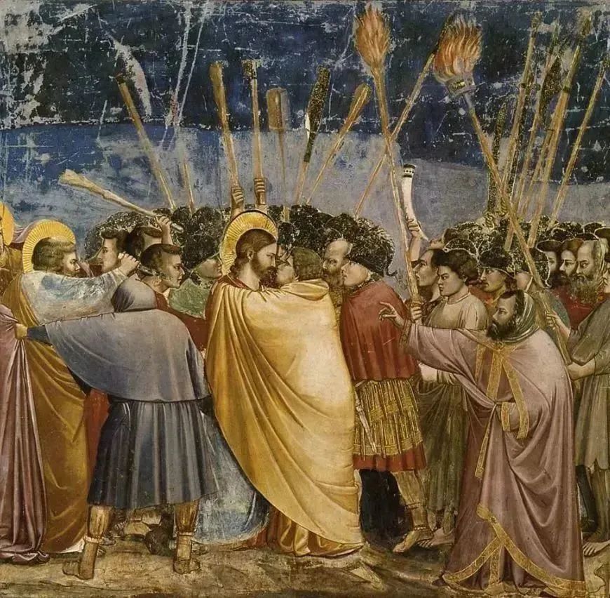 從1305年至1308年,喬托在帕多瓦的斯克羅威尼禮拜堂創(chuàng)作了一組壁畫,在教堂的左、中、右三面墻上一共繪有37幅連環(huán)畫,其內(nèi)容是描繪圣母及基督的生平事跡,《猶大之吻》是其中之一。