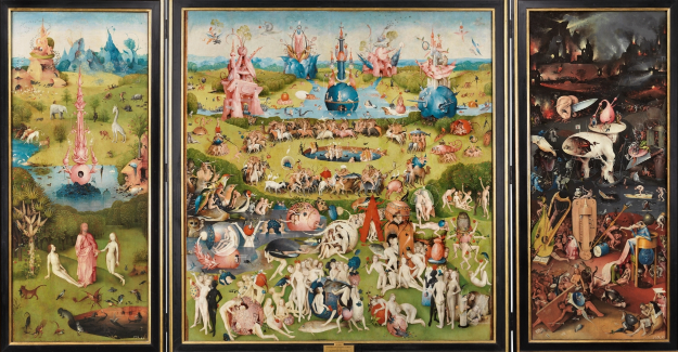 三聯(lián)畫從左到右,分別是“伊甸園”、“人間樂(lè)園”、“地獄”。這三個(gè)場(chǎng)景是聯(lián)系在一起的:它們分享了同一條地平線,具有顏色相似的水體,同時(shí)伊甸園最右邊的蘋果林一直延續(xù)到人間樂(lè)園,將畫面分成上下兩部分?!叭碎g樂(lè)園”畫面上方有四條河流注入一個(gè)湖中,與圣經(jīng)中的描述相符。人間樂(lè)園中的人類是亞當(dāng)和夏娃的后代,因?yàn)楹笳弑桓嬷岸喈a(chǎn),去充滿并征服地球”。