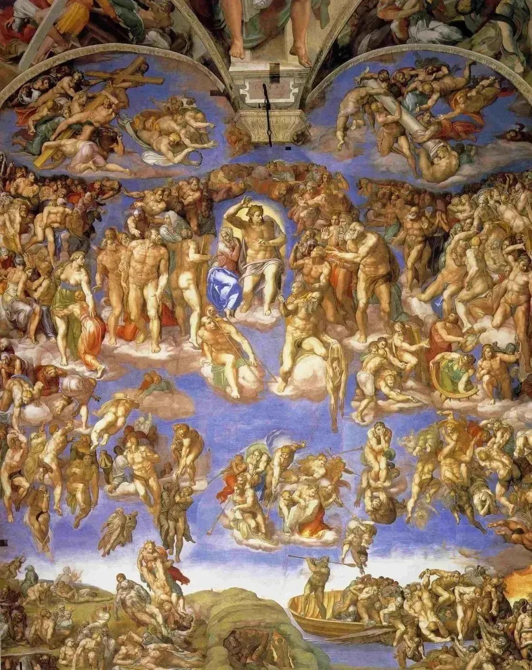 1535-1541在壁畫《最后的審判》上我們看到,上帝的右手的一觸就賦予了亞當(dāng)以生命,我們相信上帝對(duì)夏娃的創(chuàng)造。米開(kāi)朗基羅畫的全能的上帝全身處在一種動(dòng)態(tài)之中。他創(chuàng)造了人,把天與水、光明與黑暗分開(kāi)了,把亞當(dāng)和夏娃趕出了天堂,這些神話故事在畫中獲得了驚人的說(shuō)服力。