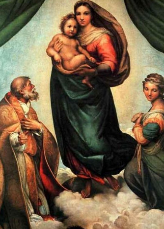 The Sistine MadonnaRaphael1513這幅畫中的圣母被世人認(rèn)為是圣母畫中的絕品,畫中的圣母一掃中世紀(jì)以來(lái)的圣母像中那種冰冷、僵硬、不可親近的模樣,將圣母描繪成一個(gè)美麗、溫柔、充滿母性的意大利平民婦女,她的臉上洋溢著坦然的驕傲;為自己手中懷抱著的基督,她的臉上又洋溢著深厚的帶有犧牲精神的母愛(ài),因?yàn)樗龑⒁研膼?ài)的兒子奉獻(xiàn)給人世。