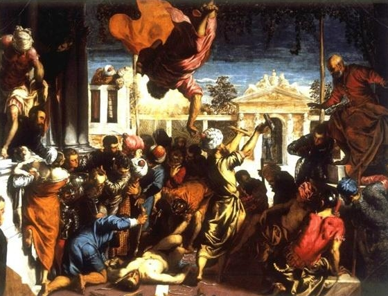 這幅《圣馬可的奇跡》,是集中反映勞動(dòng)人民凄慘遭遇的一幕情景,但畫家是借著宗教的外衣把它表現(xiàn)出來(lái)的。《圣馬可的奇跡》畫的是基督教還未被統(tǒng)治者承認(rèn)的年代的故事:一個(gè)奴隸信徒被異教徒(在基督教的精神世界里,凡不信該教的,都被稱作異教徒)們抓住,在剛要被虐殺的時(shí)候,圣馬可(威尼斯城的守護(hù)神)從天而降,拯救了他。