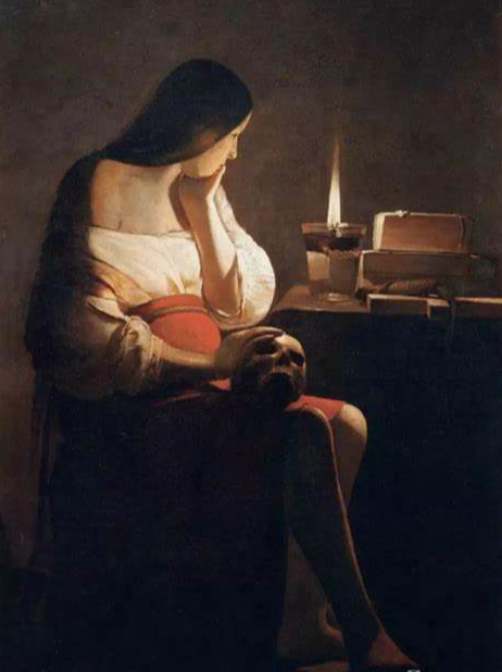 拉圖爾將墨大拉表現(xiàn)得樸素、哀婉,絲毫不見(jiàn)華麗的服飾和世俗的享樂(lè),只有明晰、沉靜的反省。若細(xì)心觀察,或許你會(huì)體會(huì)出畫家在構(gòu)思上的一個(gè)秘密:墨大拉的頭、膝上的骷髏頭、桌上的書(shū),正好形成一個(gè)三角,將中心的燭光圍起來(lái),以唯一的光源吸引人們的視線,使觀者被眼前這種謐靜的氛圍所感染。