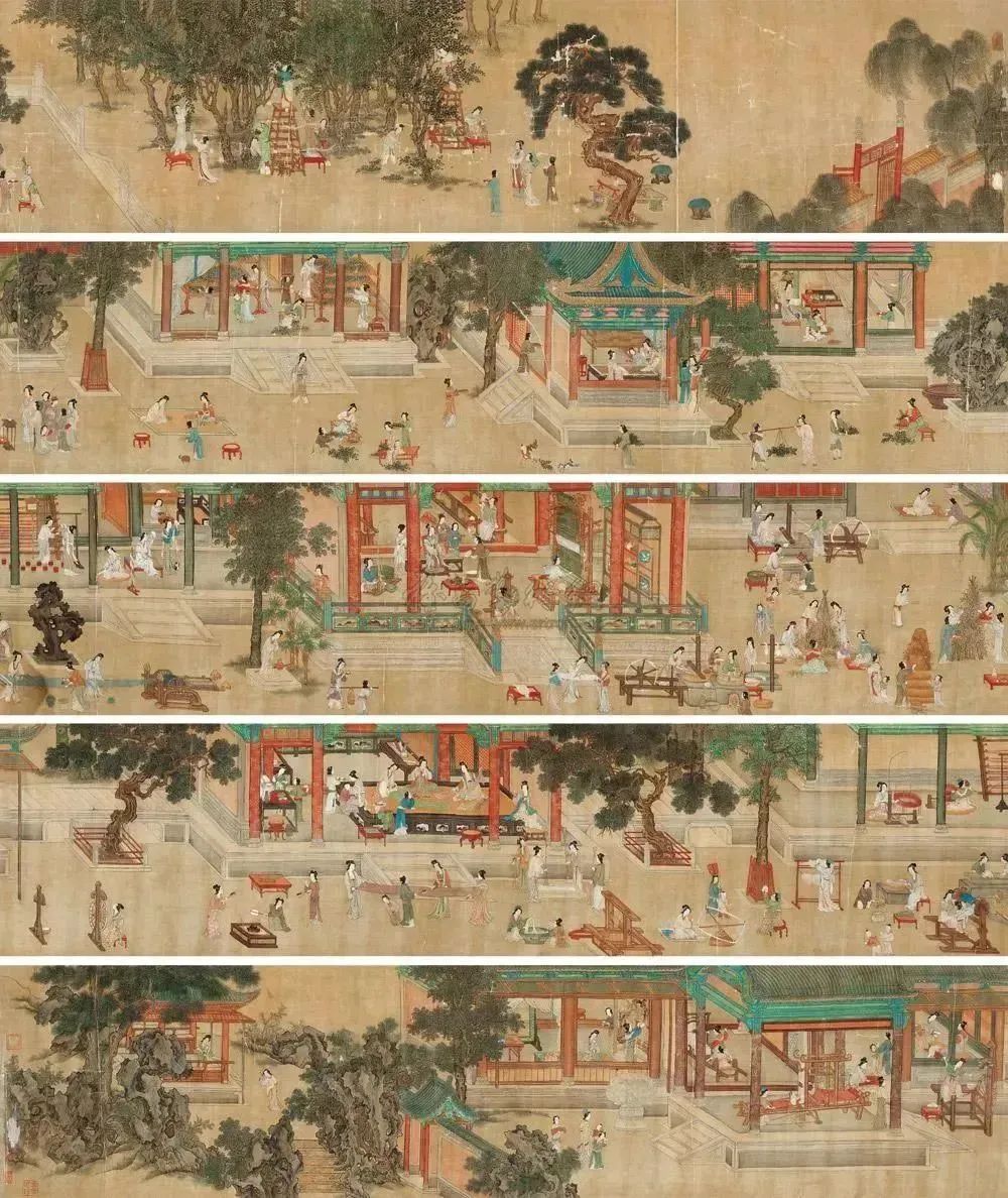 《漢宮春曉圖》以人物長(zhǎng)卷畫,生動(dòng)地再現(xiàn)了漢代宮女的生活情景。其畫題即高度概括了繪畫的題材與內(nèi)容:鼎盛與繁華象征的“漢宮”,引人產(chǎn)生無(wú)限遐想的“春曉”。在這里,仇英以春日晨曦中的漢人宮廷為題,描繪了宮廷仕女生活的場(chǎng)景,表達(dá)了他對(duì)宮廷浮華美好生活的贊美。