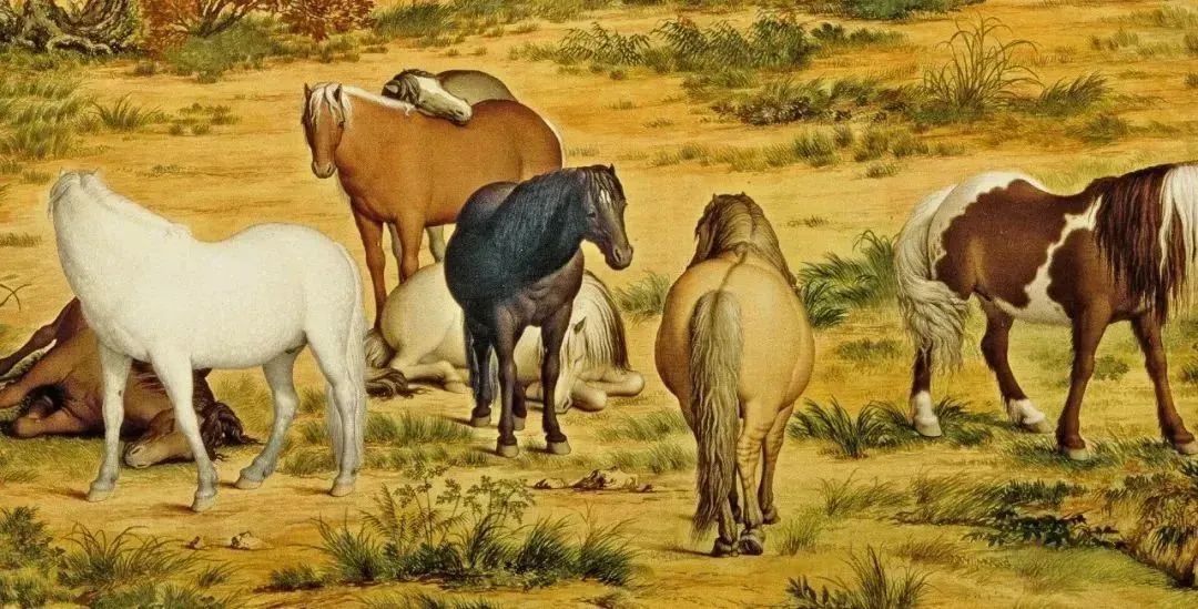 全幅畫面色彩濃麗,構(gòu)圖繁復(fù),形象逼肖。郎氏擅以中國(guó)傳統(tǒng)繪畫技法加入西洋光影透視法及西畫顏料,以顯示中西趣味兼容并蓄的畫面。如畫中馬匹、人物、樹木、土坡皆應(yīng)用了光的原理,使物象極富立體感。而如松針、樹皮、草葉等的墨線勾勒,石塊土坡的皴擦等仍含有中國(guó)傳統(tǒng)畫的技法。