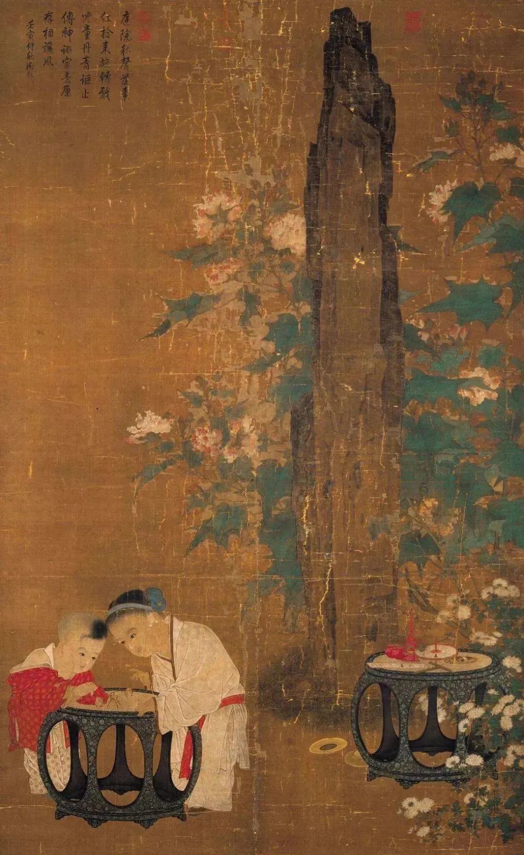 《秋庭戲嬰圖》以細(xì)膩的筆法,描繪兩個(gè)錦衣孩童在庭院玩著一種推棗磨的游戲。兄妹兩人無(wú)論從頭發(fā)、眉目,衣飾,都精心刻畫,絲染兼?zhèn)?,而且變化極為豐富,以長(zhǎng)而圓潤(rùn)的線條,畫出衣紋,再仔細(xì)點(diǎn)染衣服上的花紋,不僅畫出質(zhì)料的柔軟細(xì)致,更賦予衣服華麗的質(zhì)感,這些細(xì)微的處理,使得子孩豐潤(rùn)、柔軟、細(xì)致的模樣,躍然于紙上。