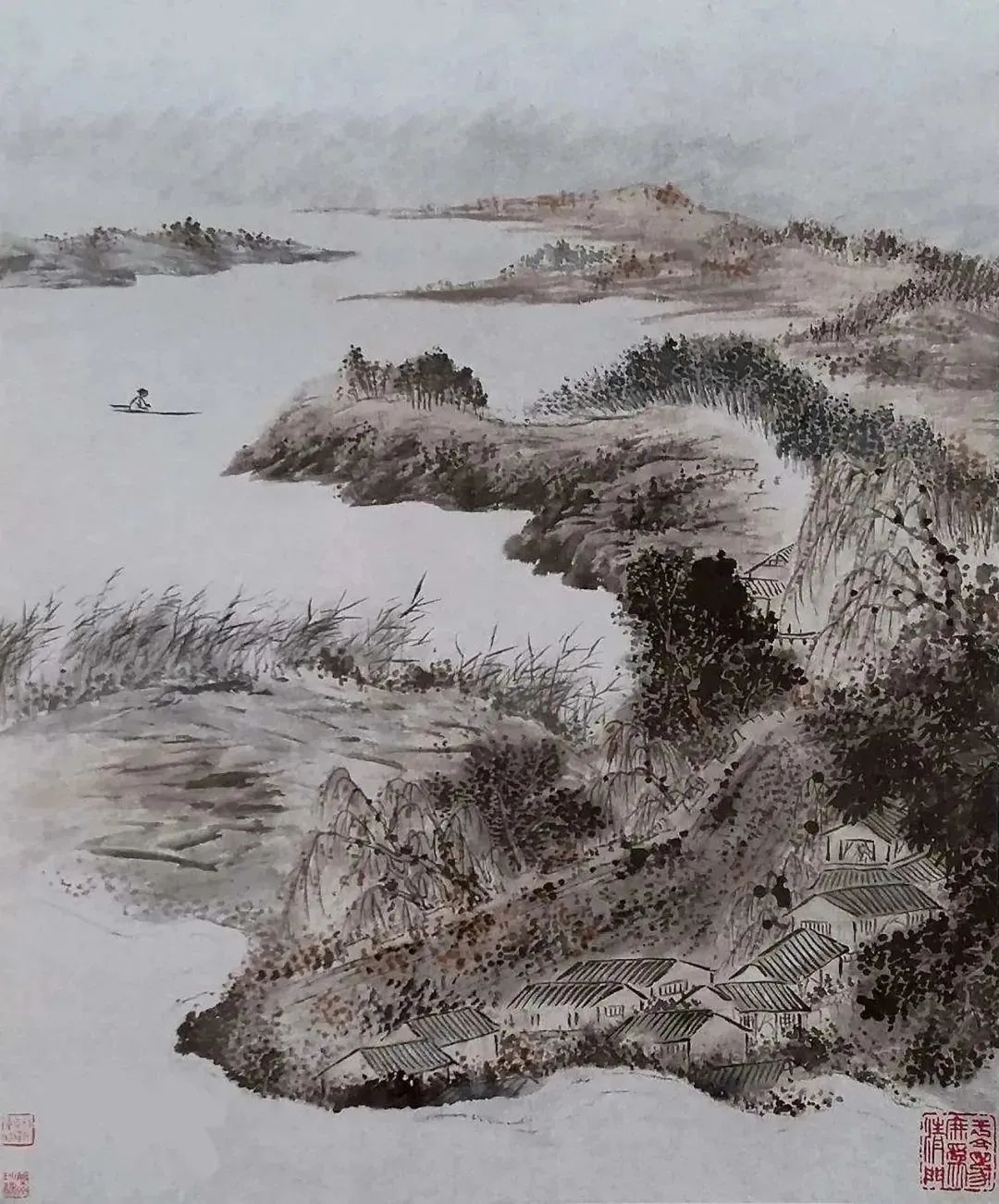 《淮揚(yáng)潔秋圖》描繪了秋水茫茫、天闊蕭冷的淮揚(yáng)秋景,河岸蜿蜒曲折,與天相接,近處有房舍橫七豎八地坐落在坡坳之中,坡坳外樹木尚且蔥蘢,沿著河道逶迤而去、柳樹低垂間,枯葉綴于樹上,蒲草凄凄隨風(fēng)搖蕩,點(diǎn)明了“秋”的時(shí)節(jié)。