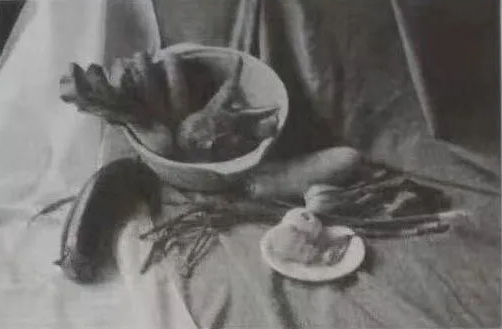 靜物組合,照片模擬寫生,深色陶瓷花瓶1個,深色大李子2個,芒果1個,紅色辣椒1個,小野果子若干,魚形陶瓷擺件一個;深色、淺色、亮色襯布各一塊。場景默寫,一位騎在自行車上的男青年,一只腳支撐在地面上,雙手扶在車把手上。