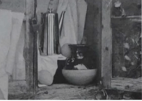 靜物組合照片,木質(zhì)舊柜內(nèi)有一把新不銹鋼壺、一個陶罐、一個檸檬、一個橙子、—塊灰白色襯布。默寫一位正在拔河的男青年,要求雙手抓繩、重心向后、頭部后仰。